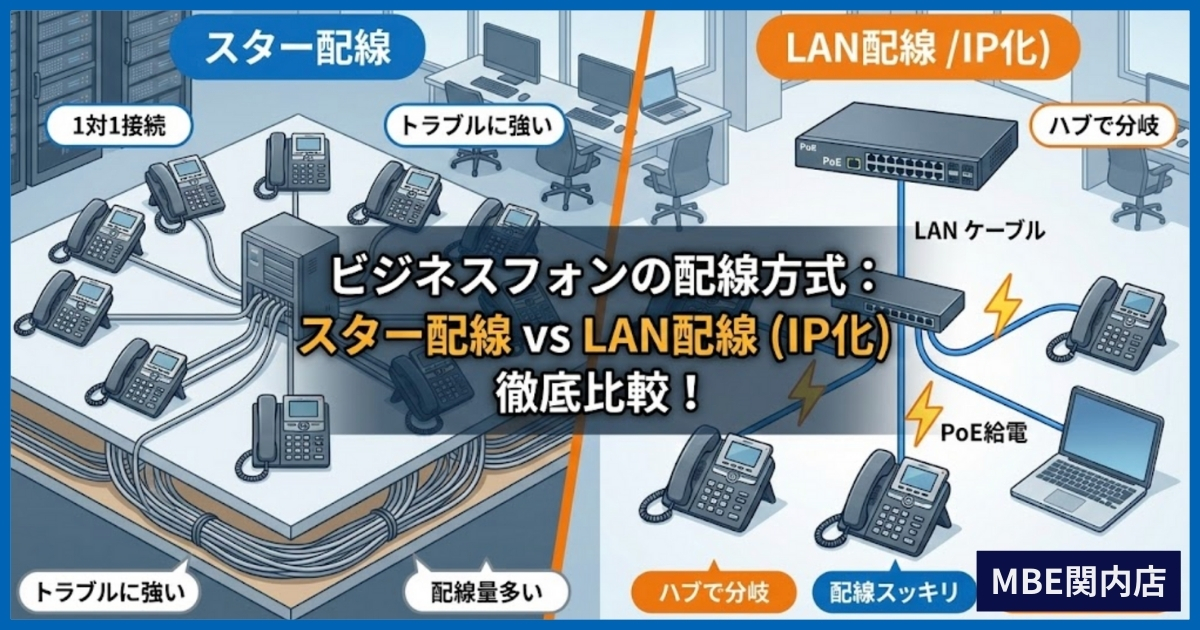 主装置が決まったら、次は「配線方式」です。最近は電話線が床を這う風景は減りましたが、床下や天井裏では今でも重要な配線が行われています。大きく分けると「スター配線(放射状)」と「LAN配線」があります。