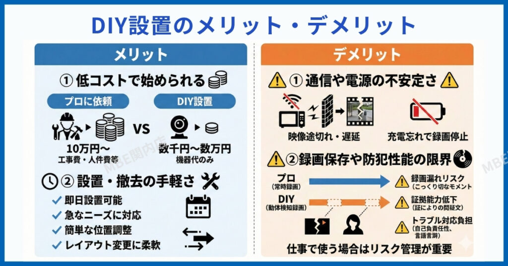 自社で用意して自分で設置する防犯カメラには、良いところもあれば、注意したいポイントもあります。