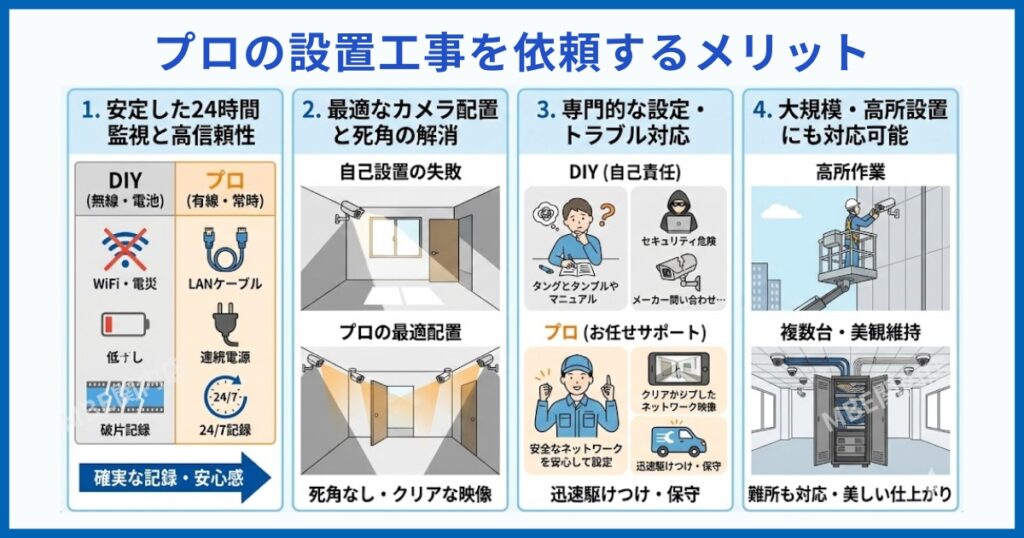 こうしたDIYカメラの弱点をカバーし、仕事で使うのに必要な「確実性」を提供するのが、専門業者による設置工事です。MBE横浜のような専門店に頼むと、どんな良いことがあるのでしょうか。